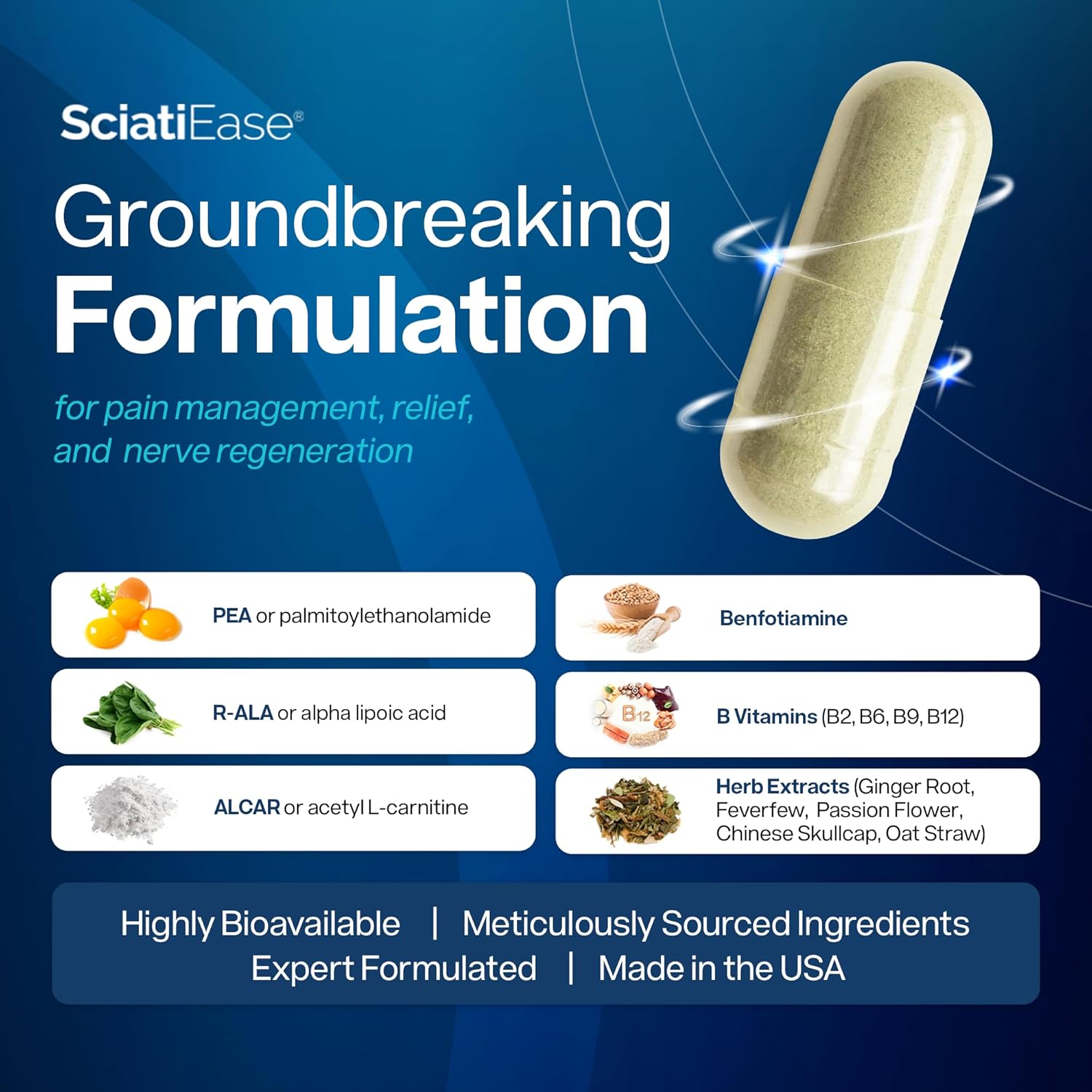 It's specifically designed to help ease nerve discomfort in the sciatic nerve, back, hip, buttocks, and leg by supporting “Sciatic Nerve Health”. The science-backed ingredients in SciatiEase can help you feel better than you have in months or perhaps even years.